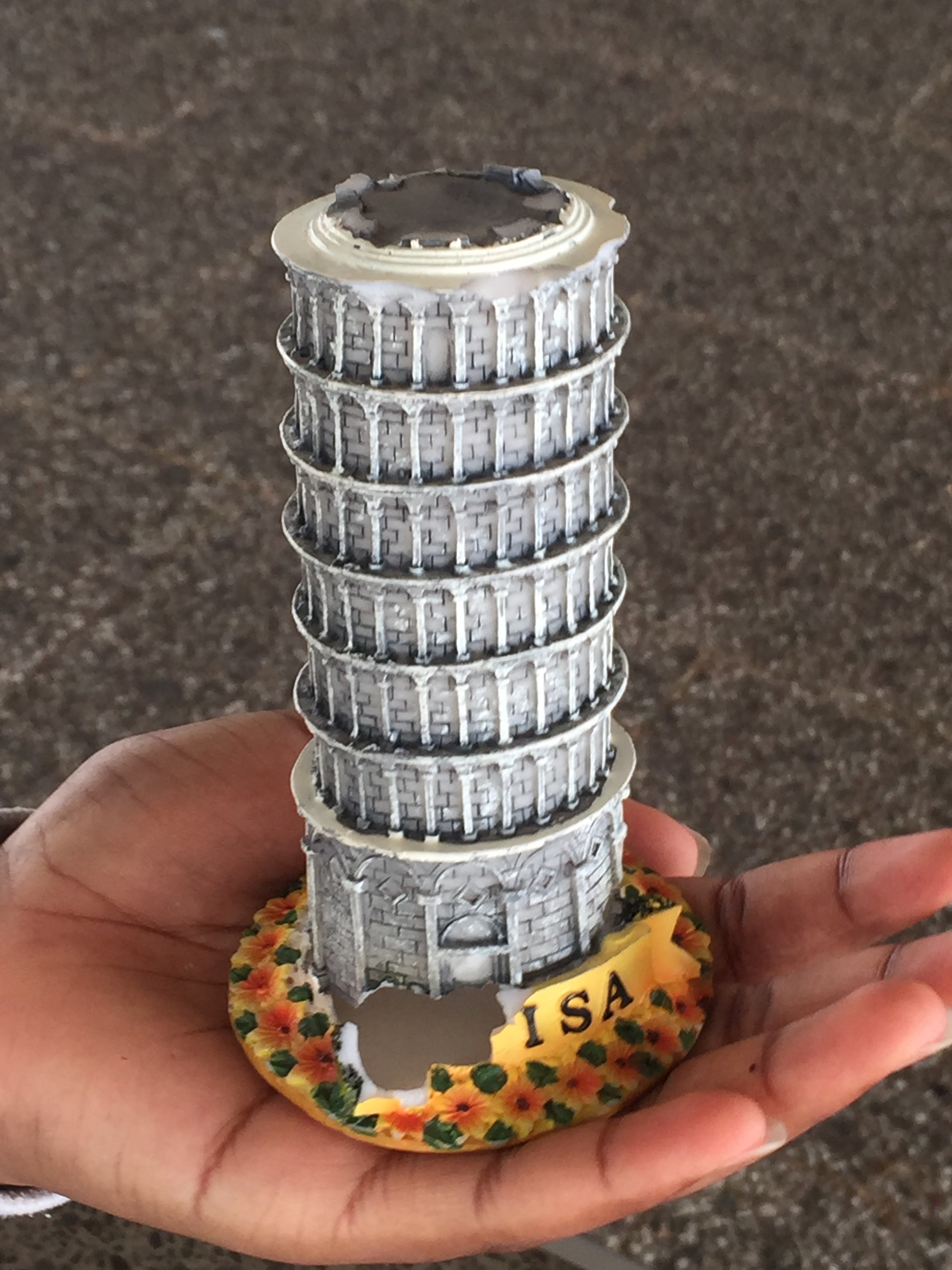 Ich habe den Turm in Pisa als ich in Italien war gekauft. Das ist der schiefe Turm von Pisa. Er ist aus Plastik, unten grau und oben gelb mit etwas orange. Unten an der Seite hat der Turm ein Loch. Er ist mir mehrmal runter gefallen. Manchmal fühle ich mich traurig und manchmal glücklich, wenn ich den Turm anschaue, weil er mich an meine Freunde in Italien erinnert. Meine Freunde werde ich vermutlich nie mehr sehen können. Ich habe ihre Telefonnummer verloren.